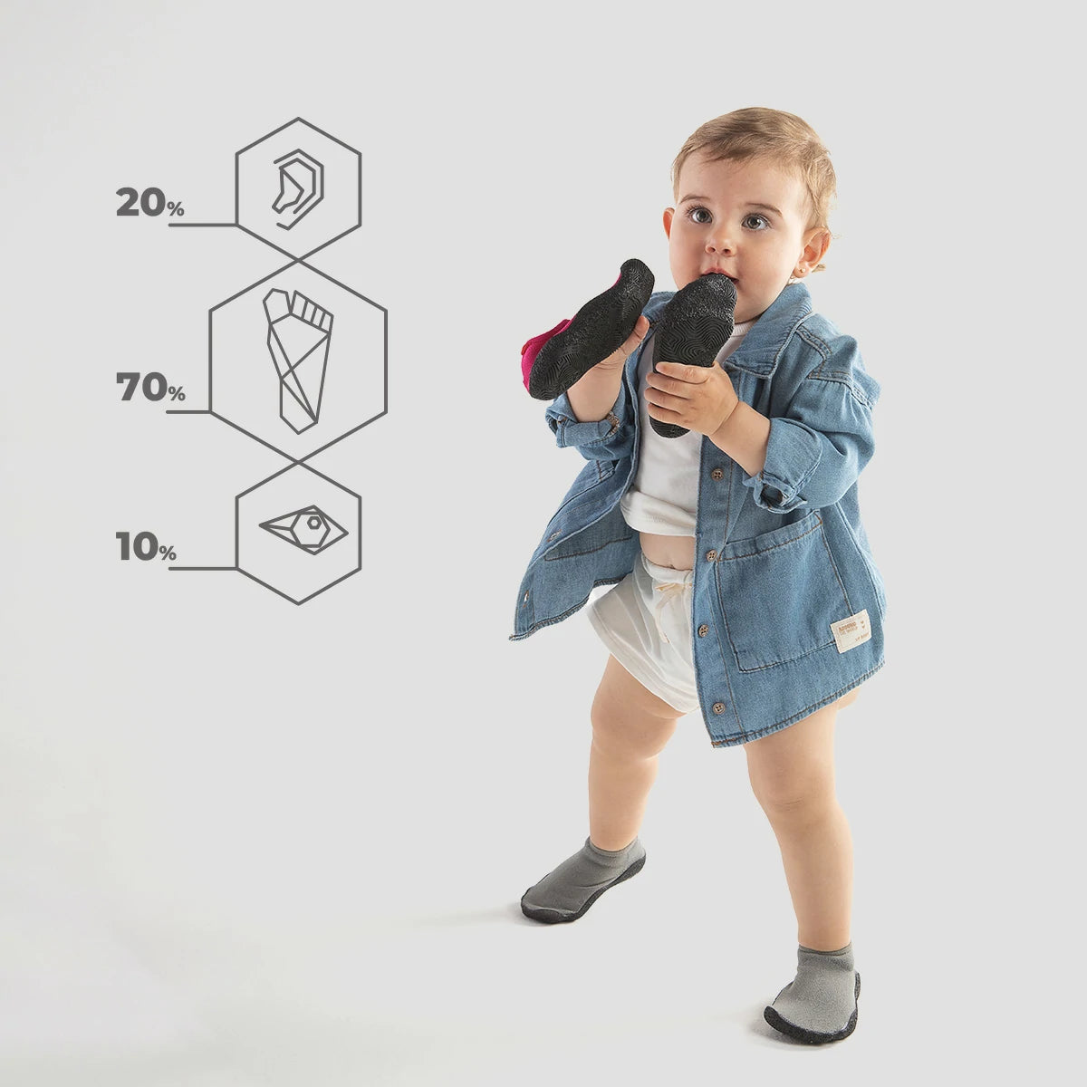 Os pés são a principal via sensorial para as crianças compreenderem o ambiente e desenvolverem o equilíbrio. Cerca de 70% dessa percepção vem do contato direto com o solo. O design da Sapatilha Bloom favorece essa conexão, permitindo que os pés processem informações sensoriais e proporcionando vários benefícios: