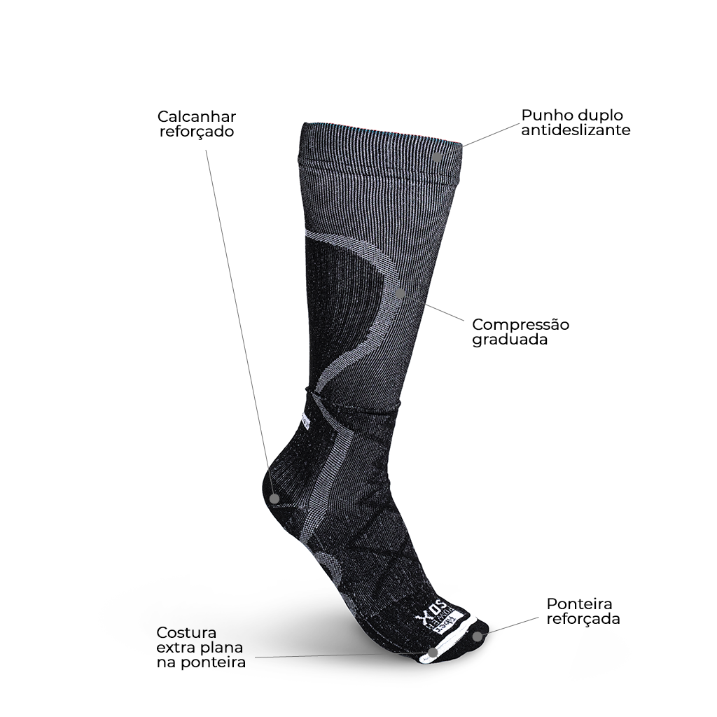 Punho duplo antideslizante, permite maior tração, garantindo que a meia fique posicionada no local adequado.