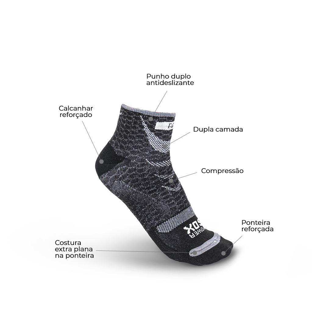 Meia de compressão com dupla camada reversível. Camada interna de microfibra que expele a umidade, mantendo o pé seco. Camada externa de compressão que contribui com a circulação do sistema sanguíneo e com a contenção muscular.