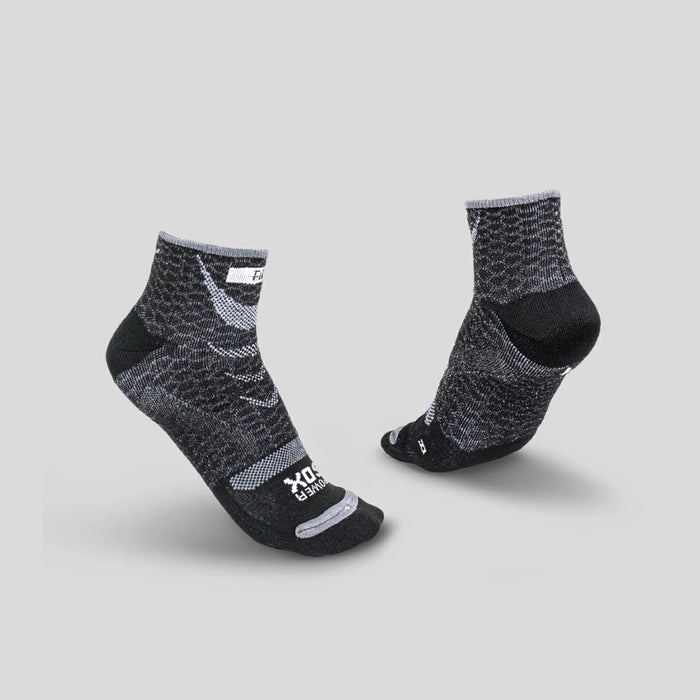 Meia de compressão com dupla camada reversível. Camada interna de microfibra que expele a umidade, mantendo o pé seco. Camada externa de compressão que contribui com a circulação do sistema sanguíneo e com a contenção muscular.