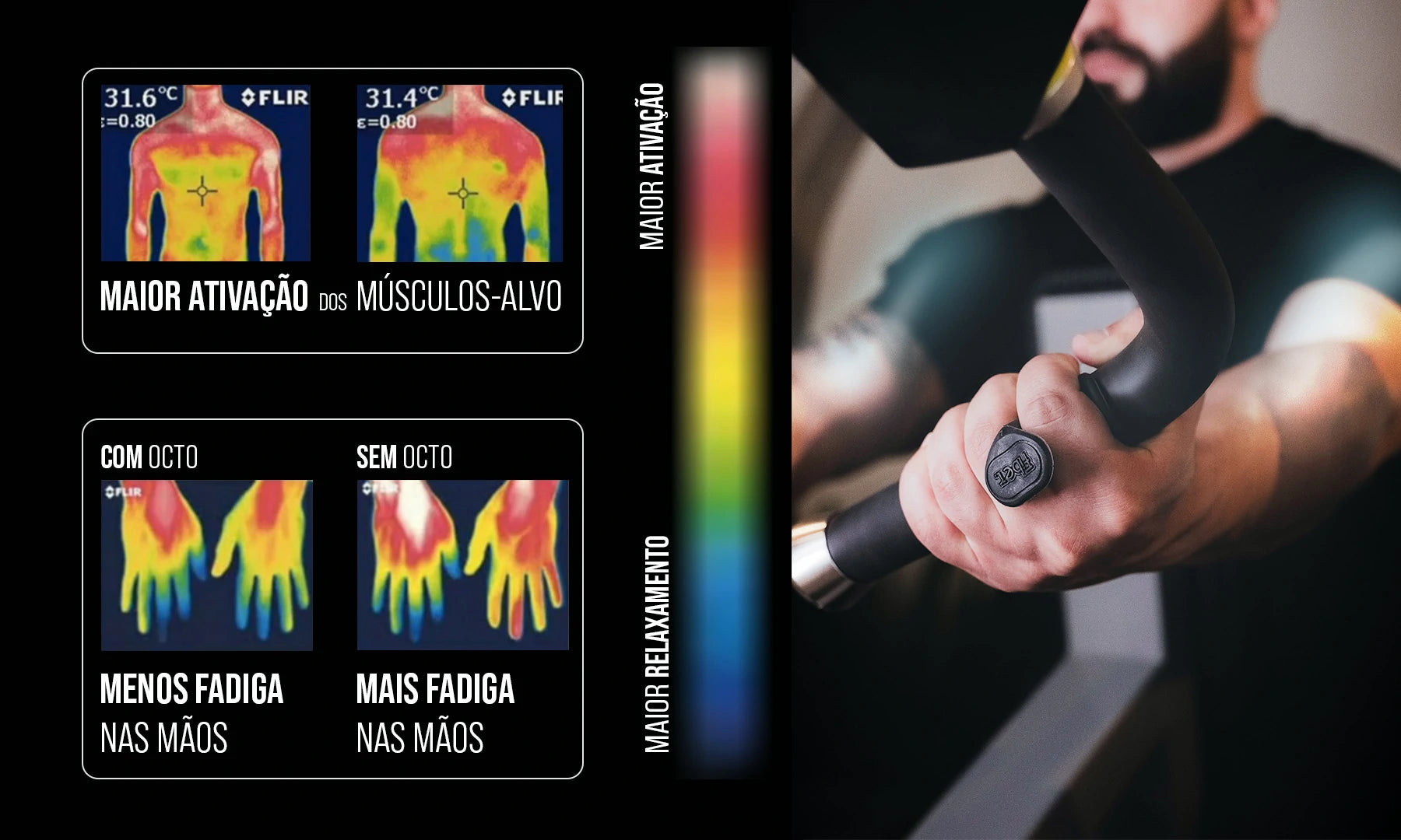 Com a mão relaxada, os músculos alvo, são ativados de maneira mais eficaz. A anatomia do Octo direciona adequadamente a força para os locais corretos, garantindo que os músculos trabalhem de forma mais eficiente, especialmente sob grandes cargas e repetições.